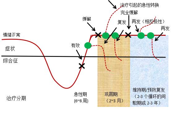 由于雙相障礙幾乎終生以循環(huán)方式反復(fù)發(fā)作,其治療目標(biāo)除緩解急性期癥狀外,還應(yīng)堅(jiān)持全病程治療原則以阻斷反復(fù)發(fā)作。醫(yī)生應(yīng)在治療開始前告知患者和家屬全病程治療的重要性及實(shí)施辦法,爭取良好的依從性。全病程治療可分為3個(gè)治療期: